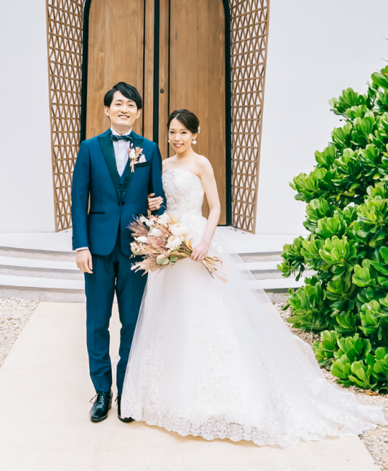 このドレスは内側がソフトマーメイド、外側がAラインという珍しいシルエットで、スタイル良く見せられるところに惹かれました。リゾート感のあるマーメイドラインに憧れていたものの、着る勇気がなかったのですが、このシルエットは抵抗なく着ることができました。(沖縄挙式 Yさま)