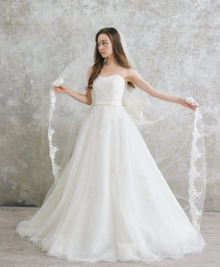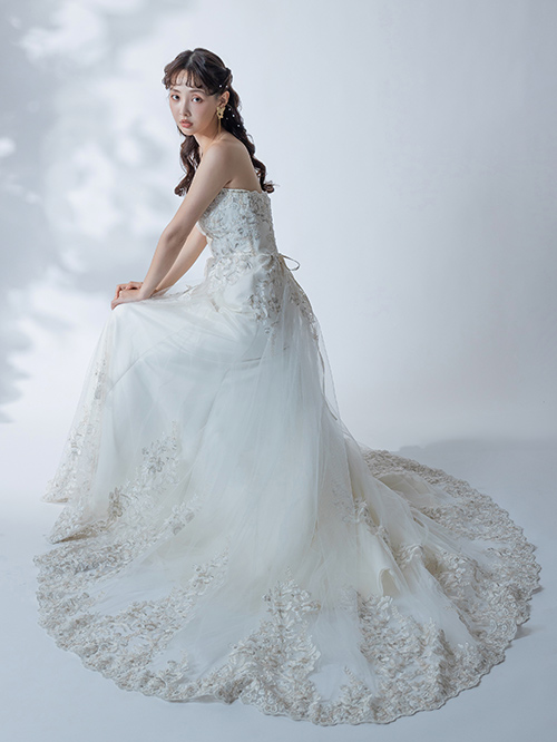マーメイドラインのスカートにAラインのチュールレースを重ねたシルエットのなかでも、一番人気のドレスがこちら。ピンクベージュの刺繍が施されたチュールレースが人気の秘密です。より女性らしさを演出したい方は、胸元をストレートラインからハートカットに変更することも可能です。