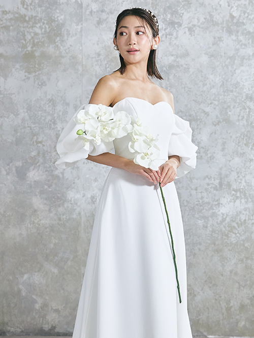 上質梨地ジョーゼットの落ち着いたマットな質感で魅せる大人スレンダードレス。甘くなりすぎないようクシャッとしたカタチにこだわったパフスリーブは、妥協のないパターンメーキングでエレガントなお袖に仕上がりました。パフスリーブは取り外し式なので、別売りの レースパフと組み合わせて2WAYの着回しもおすすめです。